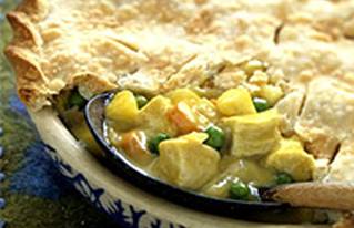 Roll out the pastry to fit the dish, place a crock egg cup or pie funnel in the centre to hold up the pastry. Wet the edges of the pastry and pinch onto the rim of the pie dish. |