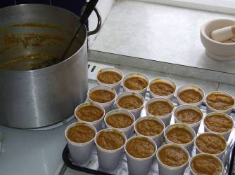 | Finally... Allow to cool for an hour or two then ladle into about 20 disposable plastic cups, cool completely then store in the freezer. | |